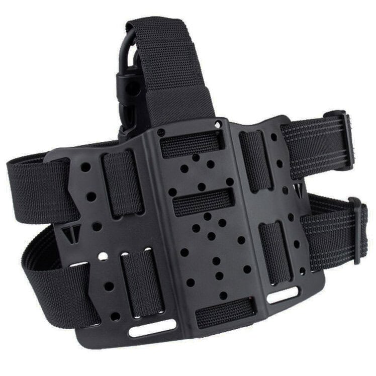 La plaque de cuisse ambidextre Bladetech permet de fixer un Holster, avec la possibilité de rajouter des accessoires sur les côtés de la plaque (porte chargeur, baton, etc).